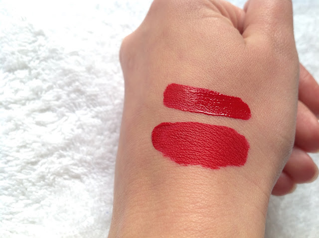 Сверху помада только нанесена, снизу - уже уселась и подсохла.